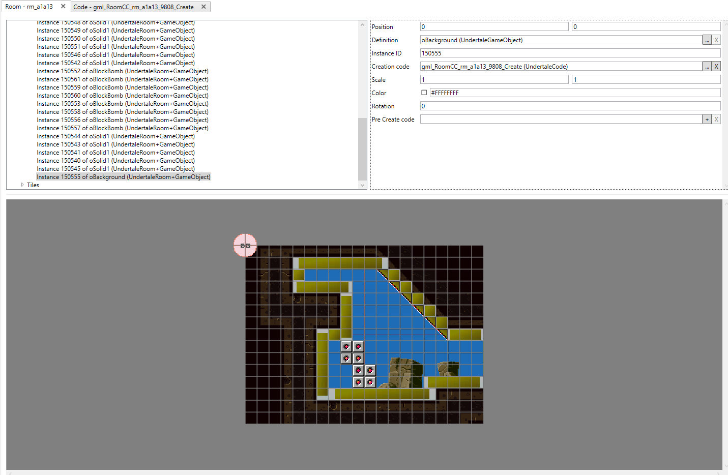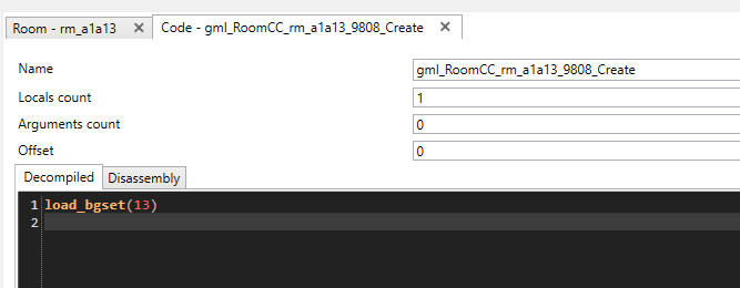 For backgrounds, you should place an oBackground object somewhere in the room. Usually they are placed in the top-left of the room. The oBackground needs creation code to function. Without it, the game will crash when trying to load the room. Right click on Code in the viewer on the left side and then click add. This will open a blank text window. As with rooms, object creation code follows a naming convention, starting with gml_RoomCC_, followed by the name of the room the object is located in (in our case it would be rm_a1a13), which is then followed by the code entry’s ID (the number that automatically generates when you first add your code element, in our case 9808) and finally _Create.