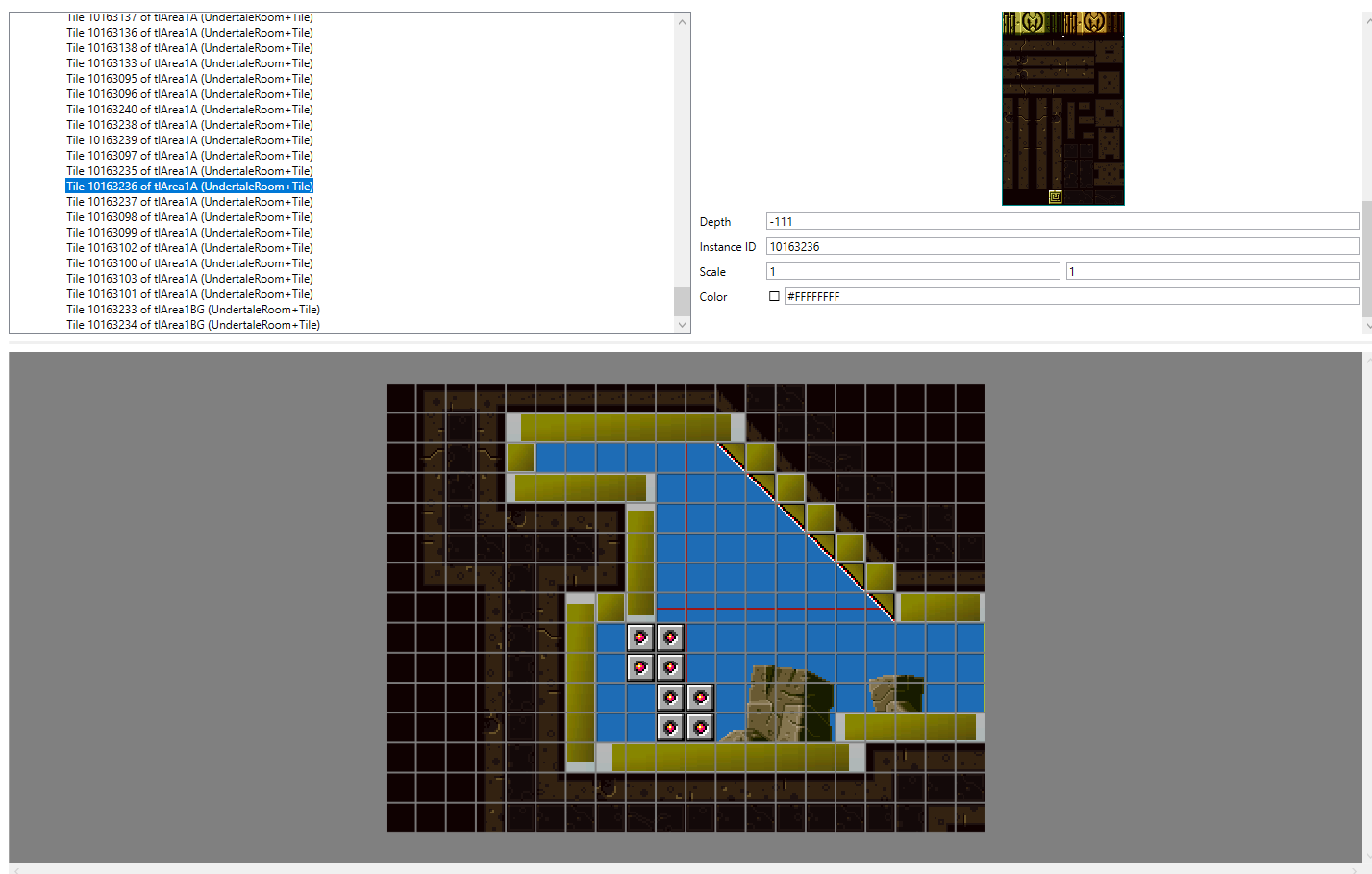Take note of the depth variable when adding tiles. Since UTMT does not have a layer system, this value is what decides which tiles are in the foreground and which are in the background, with lower values being shown in front of higher values.