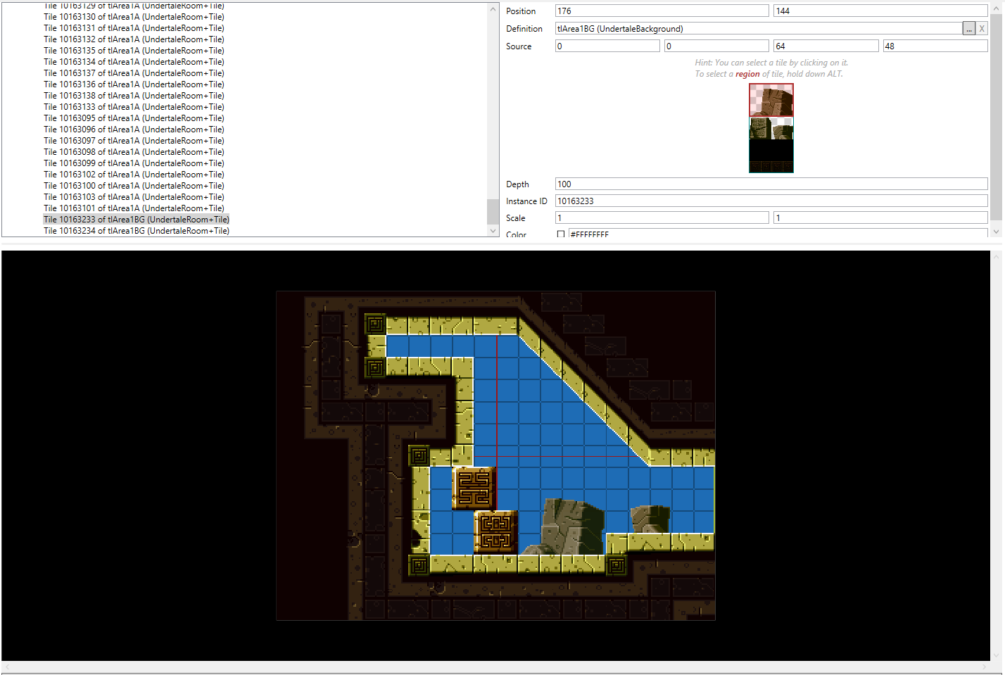 Something you can use to make the tiling process a lot faster is to duplicate existing tiles by holding ALT while click-dragging them in the room preview. This will copy everything from that tile, including depth and tileset. This drastically speeds up the tiling process, as you then don’t have to manually assign the same values to every tile.^