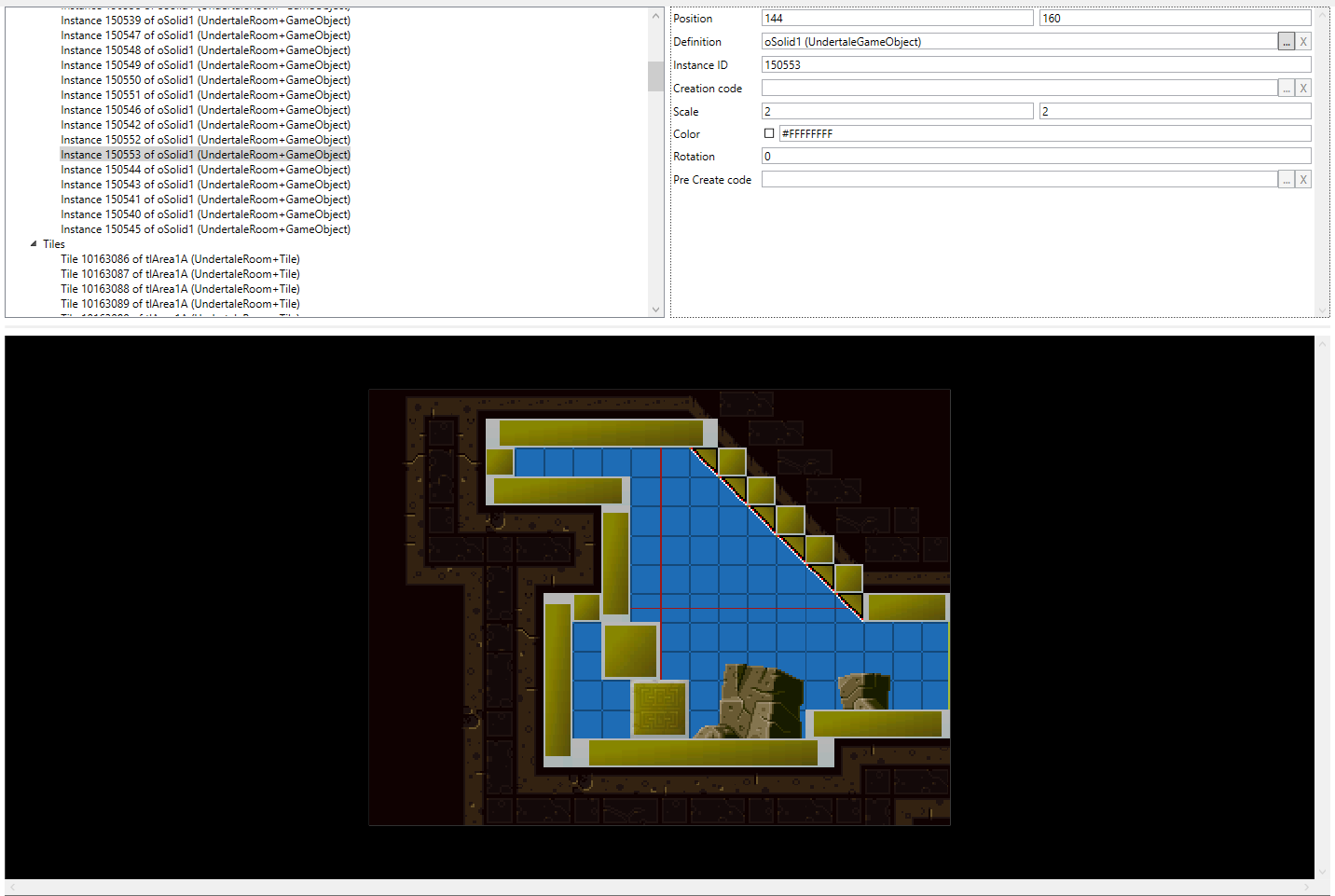 To give your room form, you can place tiles from the many different tilesets. Each tile is added individually by right clicking in the tiles section, selectingIt is generally recommended to do tiling first, as UTMT will always put the visuals for collision blocks in the foreground, meaning that doing tiling afterwards is a horrible experience.