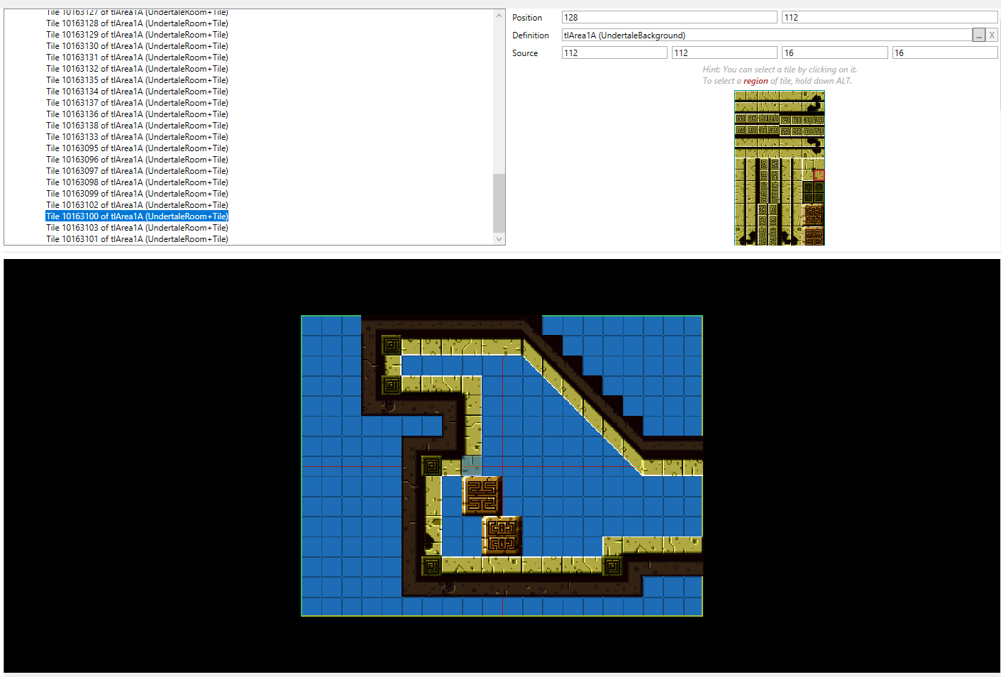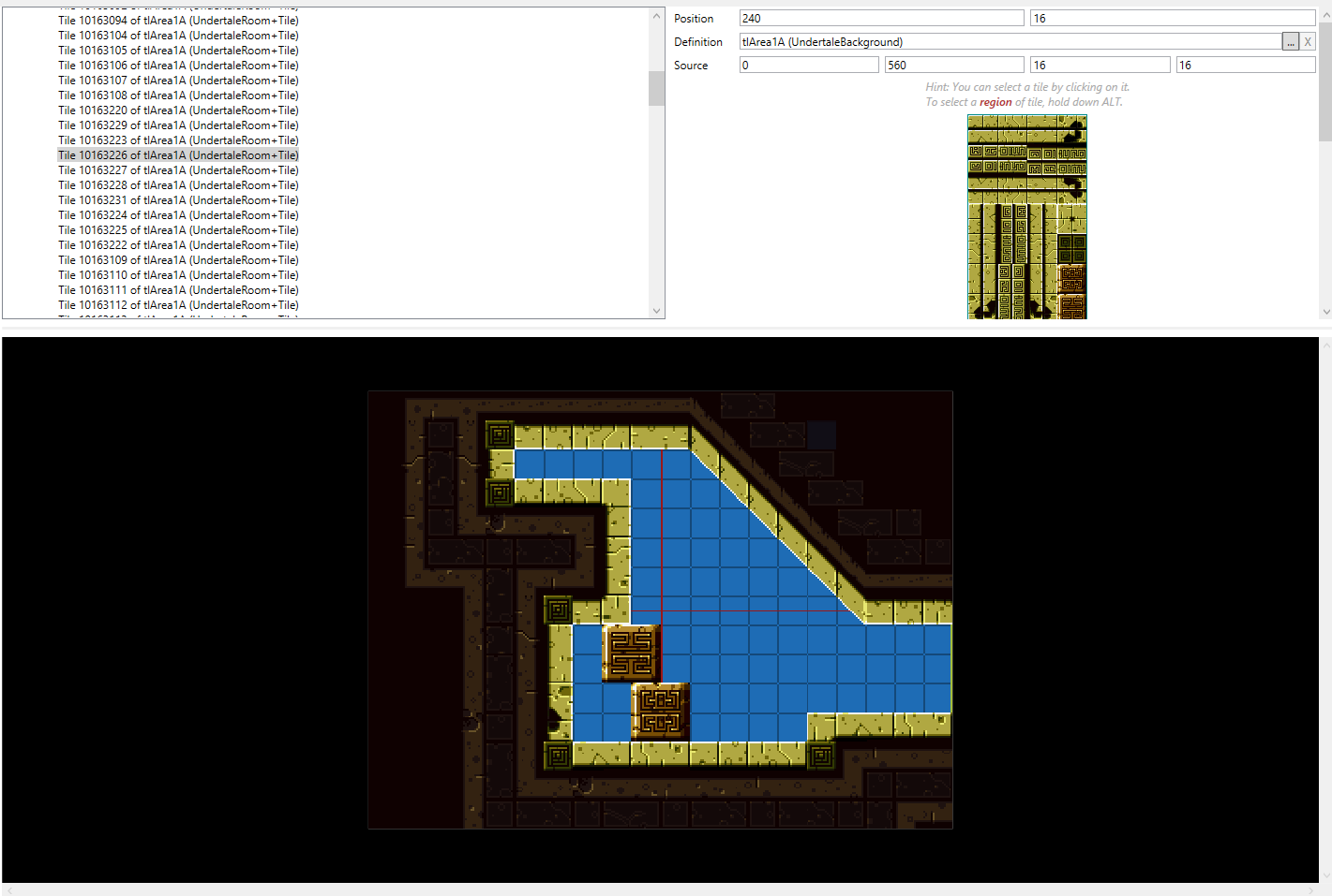 add new tile, and then dragging the tileset that you want to use over from the left into the definition. This will be a slow process. Each unit or block that represents a tile is 16x16 pixels pixels large, and can be selected manually by setting the source position and size or selected automatically by clicking on the tile you want. However the latter option is sometimes not as good for tilesets which aren’t limited to blocks. It is helpful to use an image editor to find the coordinates of specific points for the former option. Tiles that are a multiple of 16x16 can be selected by holding ALT while dragging over the tileset thumbnail in the tile’s properties.